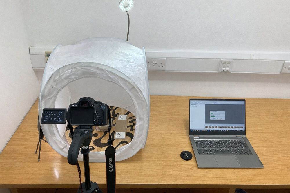 Was du brauchst: einen Laptop mit Agisoft Metashape, eine Kamera, ein Stativ, eine Fotobox mit gleichmäßiger Beleuchtung und einen Drehteller. Stelle das zu dokumentierende Objekt auf einen Drehteller mit kontrastreichem Hintergrund in die Fotobox. Sorge für gleichmäßiges Licht ohne harte Schatten oder Reflexionen. Stelle deine Kamera, am besten auf einem Stativ, vor die Fotobox.