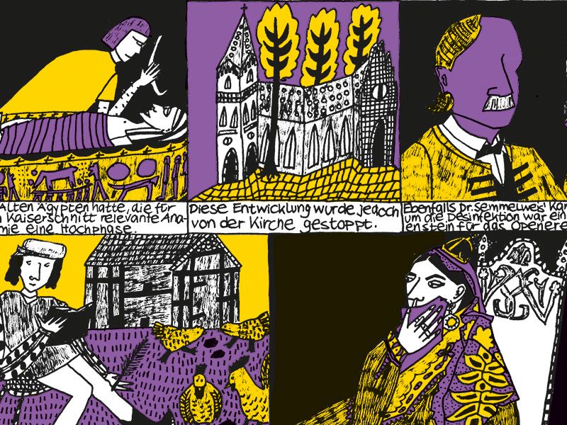Im Rahmen eines Semesterprojekts der Klasse Illustration an der Universität der Künste Berlin widmeten sich Studierende der Geschichte der Medizin. Von den ersten chirurgischen Eingriffen über Geburten per Kaiserschnitt bis hin zur Erforschung sicherer Impfstoffe haben die Leistungen vieler Teams von Forscher*innen unsere Lebenserwartung und -qualität nachhaltig verändert. Im Kurs recherchierten die Studierenden zentrale Meilensteine der Medizingeschichte und verwandelten sie in lebendige Comic-Narrationen. Dabei verbanden sie historisches Wissen mit gestalterischen Ausdrucksformen und entwickelten jeweils eine eigene Erzählperspektive.