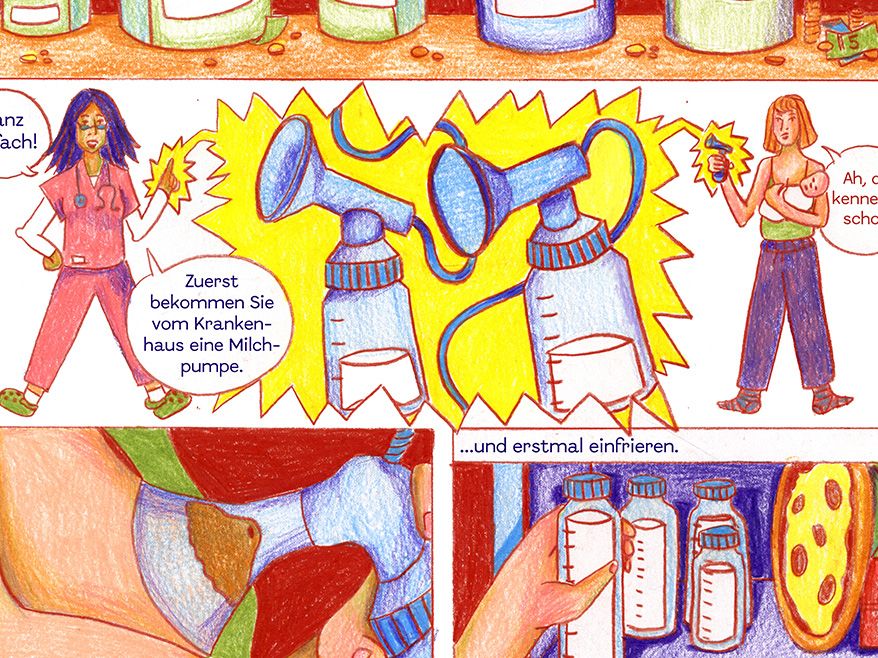 In diesem Comic werden Frauenmilchbanken erklärt: Wer kann Muttermilch spenden, wie wird diese aufbereitet und wie hilft sie Frühchen beim Überleben.