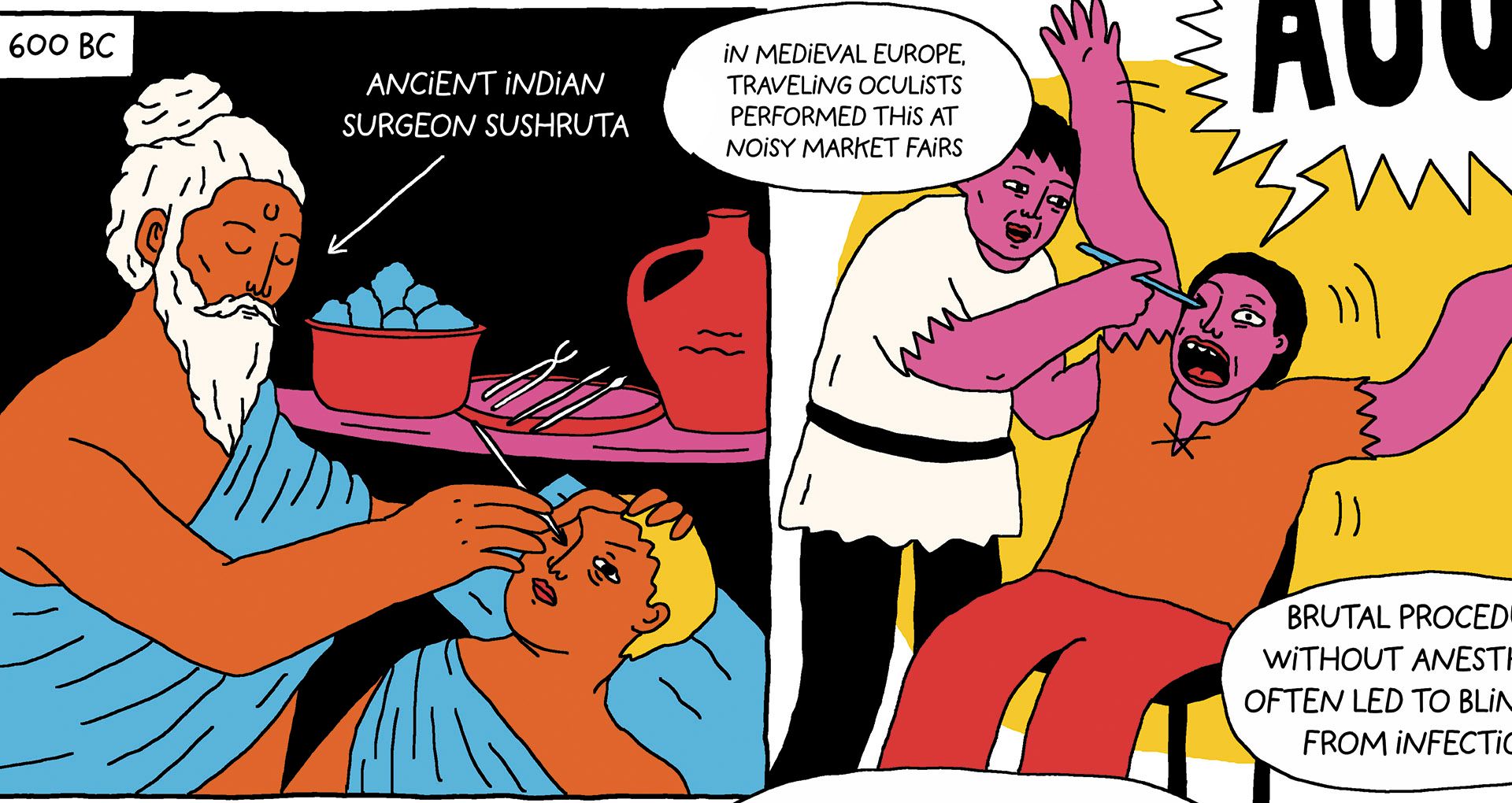 This comic explores cataract surgery — from ancient "couching" to modern procedures. While science has advanced, 94 million people lack care due to global inequality and the "brain drain". A graphic medicine story about the privilege of sight.
